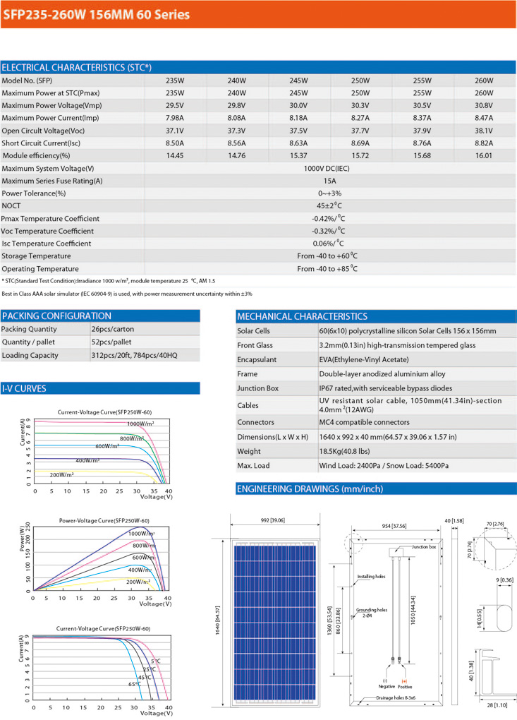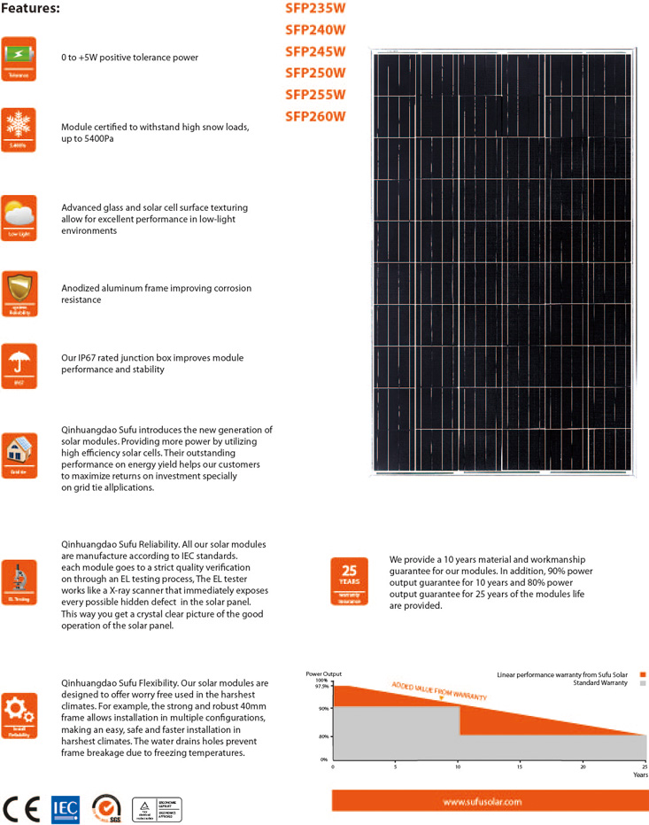 SUFU High Efficiency 60 Solar Cells SFP235W-260W